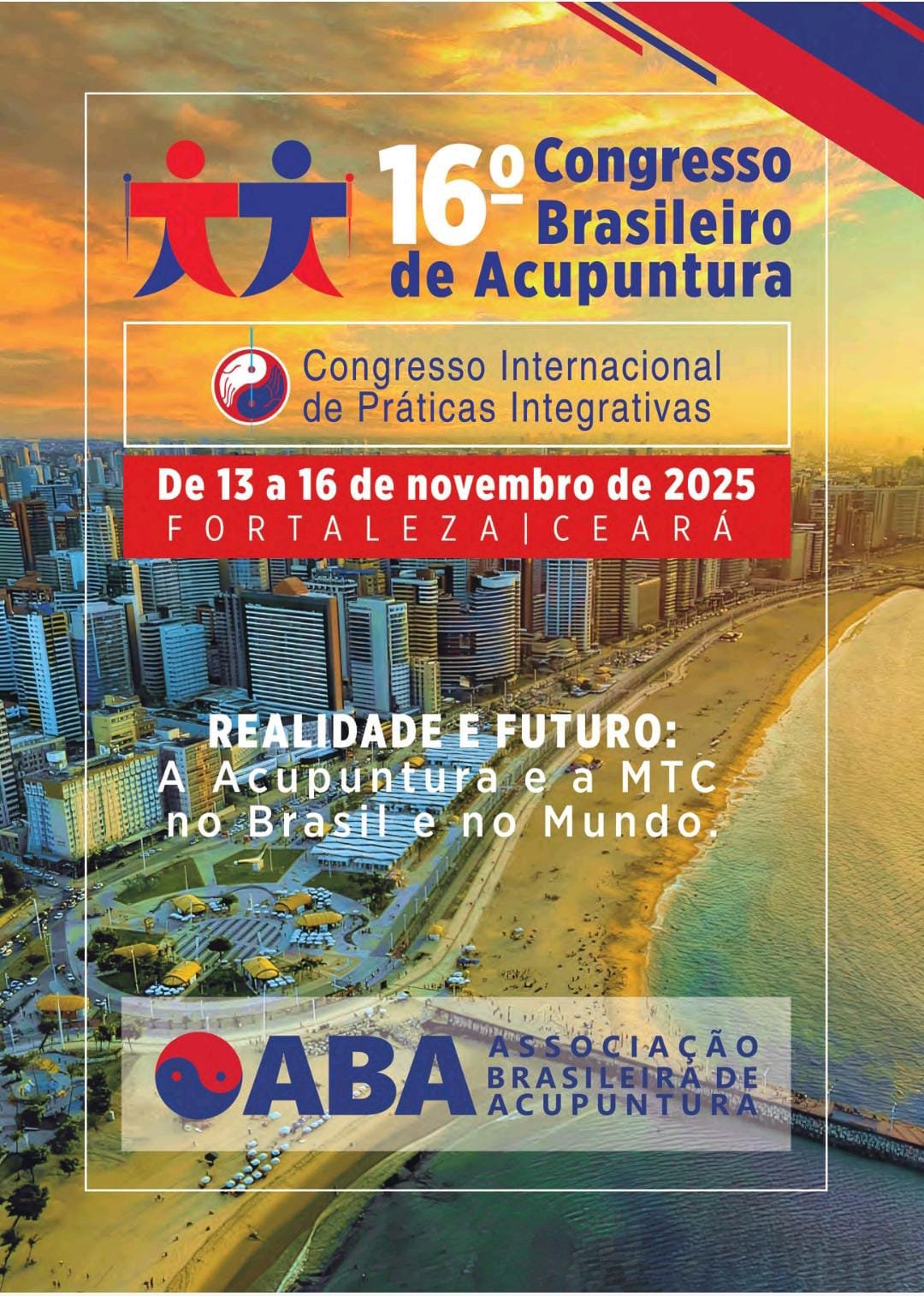 De 13 a 16 de novembro, Fortaleza será o centro do debate nacional sobre saúde integral. A capital cearense recebe o 16º Congresso Brasileiro de Acupuntura, promovido pela Associação Brasileira de Acupuntura (ABA), com o Congresso Internacional de Práticas Integrativas em Saúde (PICS). Os eventos acontecerão no Hotel Mareiro AFAGO, localizado na Av. Beira Mar, 2380 – Meireles, reunindo especialistas de todo o país e do exterior.