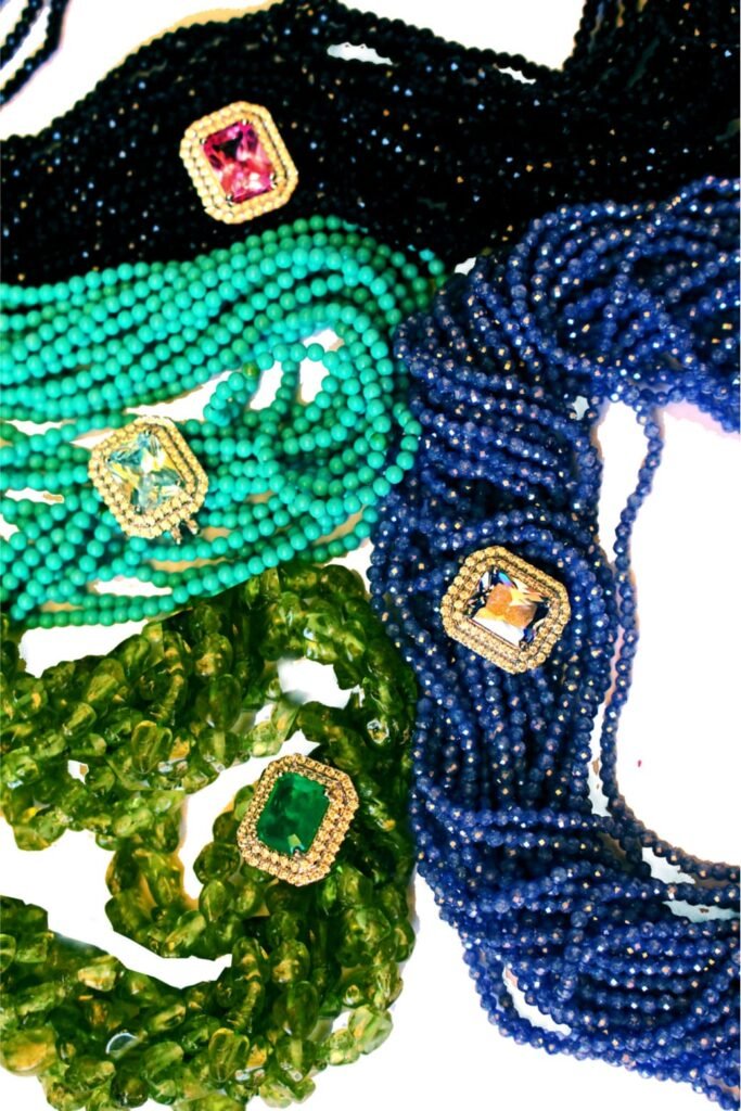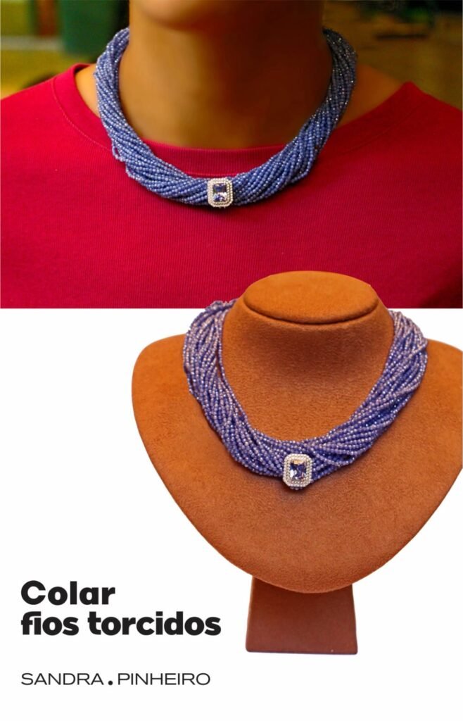 Cada colar é construído a partir de fios torcidos em tons vibrantes — rosa elétrico, verde menta, turquesa intenso, âmbar solar e o sofisticado teal — cores que despontam como protagonistas nas tendências internacionais. O detalhe central fica por conta dos pingentes de pedras naturais, verdadeiros “charms” que revelam brilho, textura e significado únicos.