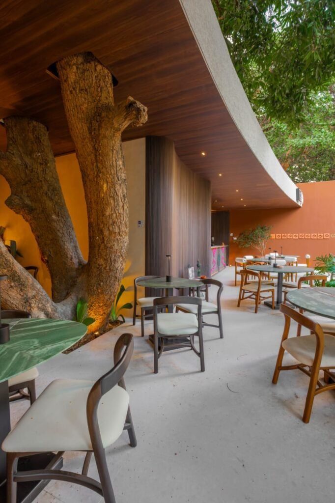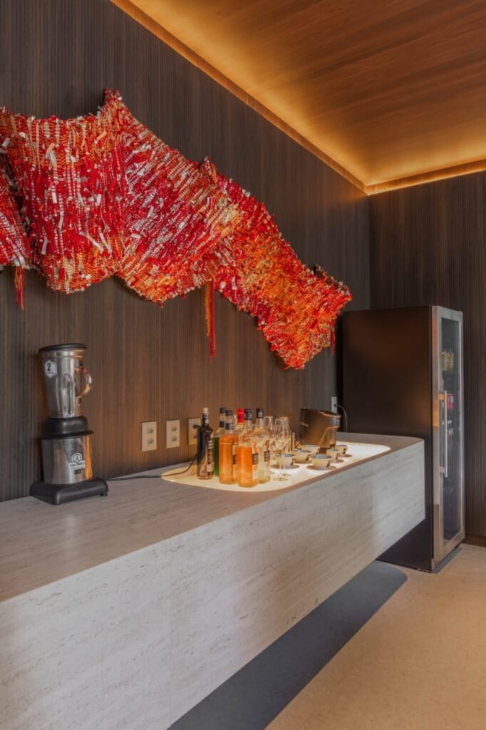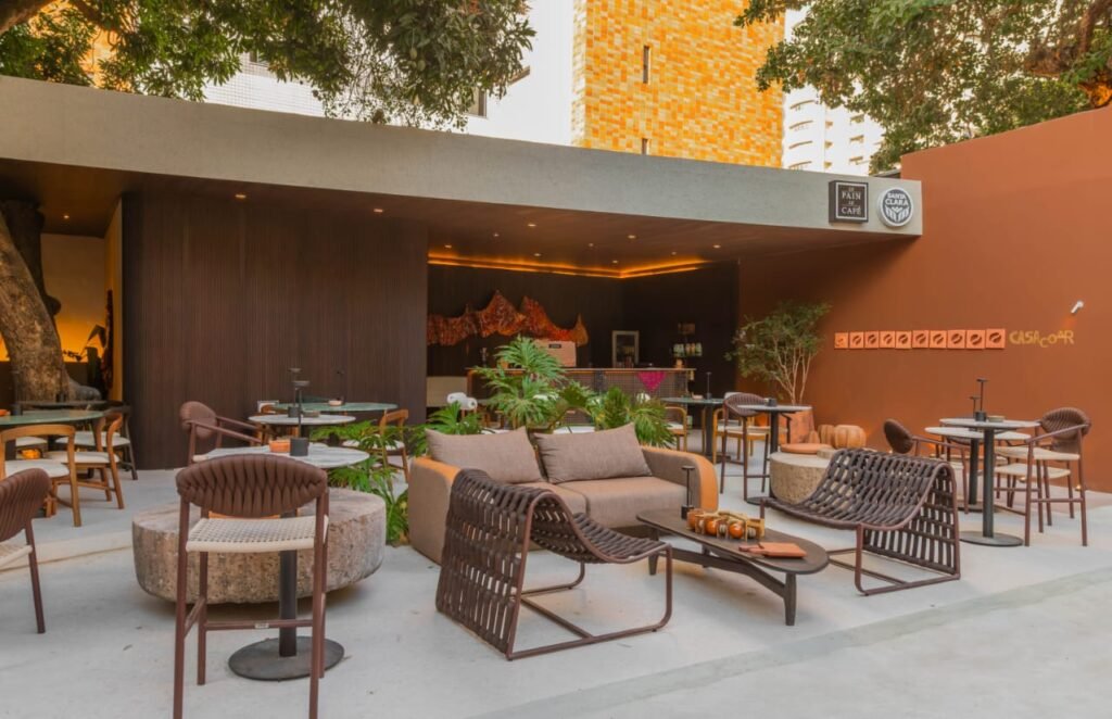 O ambiente é um convite a uma jornada sensorial, onde a paixão pelo café se encontra com um profundo respeito pela sustentabilidade e identidade cultural local. Existem detalhes que agregam valor ao projeto, como as estruturas metálicas e cobertas, antes descartadas, que agora foram ressignificadas. As mesas, criadas a partir de chapas de pedras de edições anteriores da mostra, foram transformadas em peças que celebram a memória do evento. A bancada principal é um painel feito de cápsulas de café recicladas, um tributo à economia circular e à paixão pela bebida, com um olhar atento às raízes cearenses. O mobiliário e os objetos, compostos por peças de designers e artesãos locais, criam uma atmosfera autêntica e acolhedora. No quesito arte, peças de arte foram criadas pelas mãos de Andrea Dall´Olio, reutilizando sobras de materiais de produção das embalagens de café. O resultado é um santuário de reconexão, onde o aroma do café, a solidez da pedra e o calor da arte local se unem para oferecer uma experiência única e memorável.