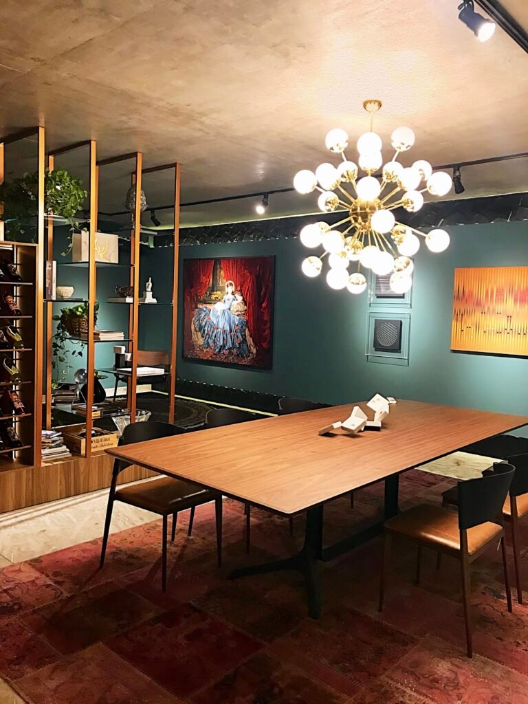 Temos um painel no teto desenvolvido pela artista Julhá, para a La Vinci Revestimentos. Os revestimentos transformam o forro em uma superfície viva, criando movimento e luz.