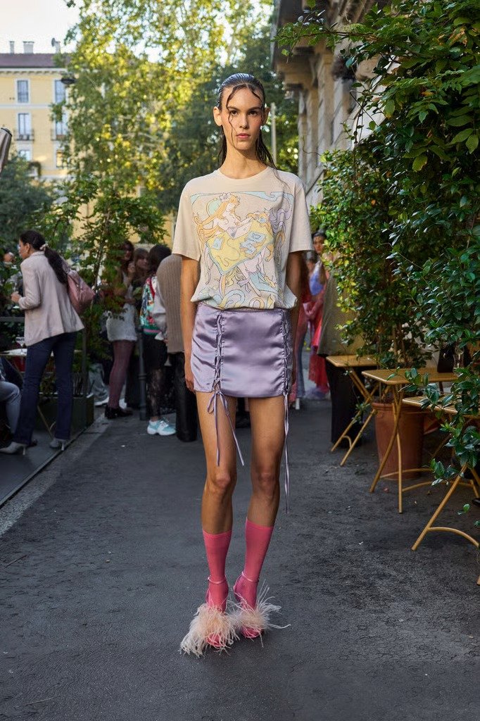 Depois de temporadas de amor pelo midi, o mini retomou o trono com força total. Saias curtíssimas, vestidos justos e shorts micro apareceram em coleções de Versace a Diesel, reafirmando que o corpo volta a ser protagonista.