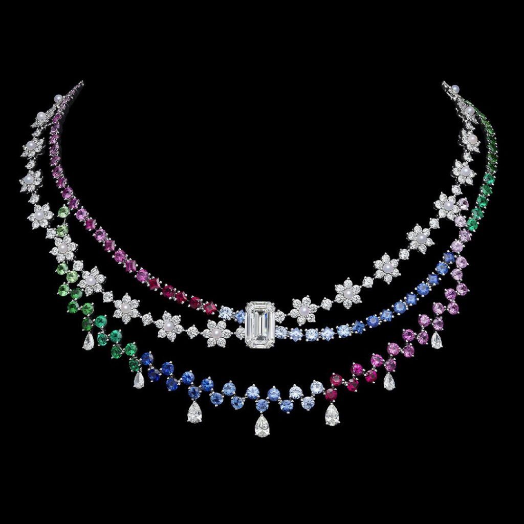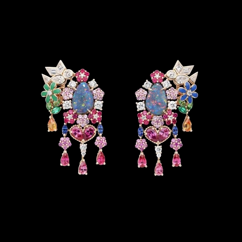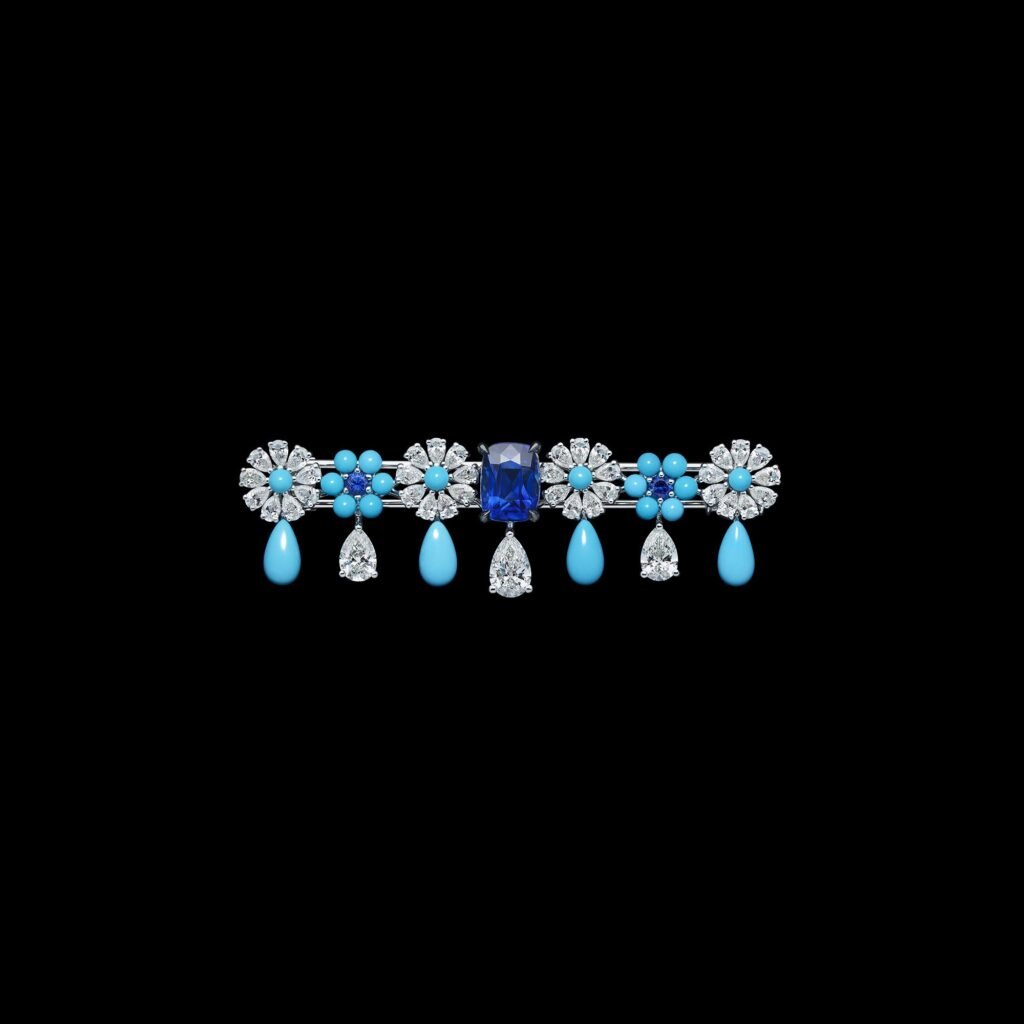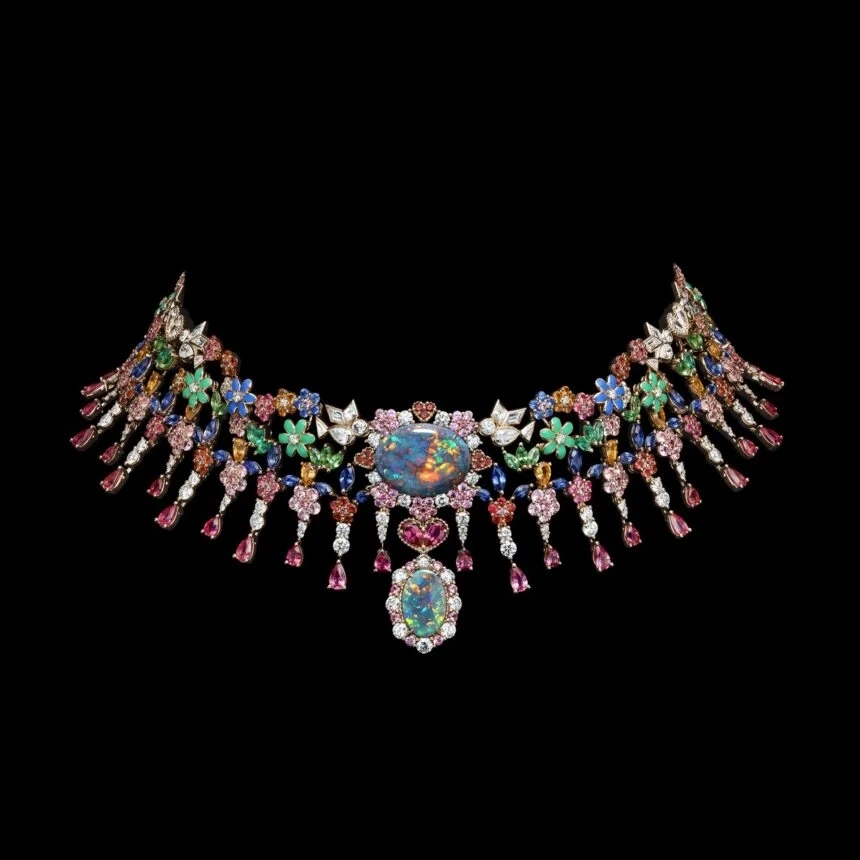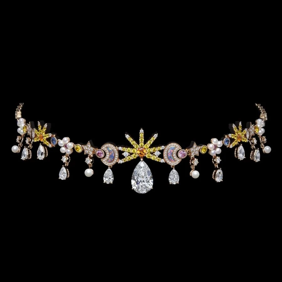 Com cerca de 60 criações, a coleção se constrói a partir de uma flora inventada, onde ouro, diamantes e gemas coloridas desenham composições que oscilam entre o real e o onírico. As peças evocam jardins em movimento, com estruturas que lembram franjas e tramas delicadas, criando leveza e fluidez, quase como tecidos em diálogo direto com o legado da alta-costura da casa francesa.