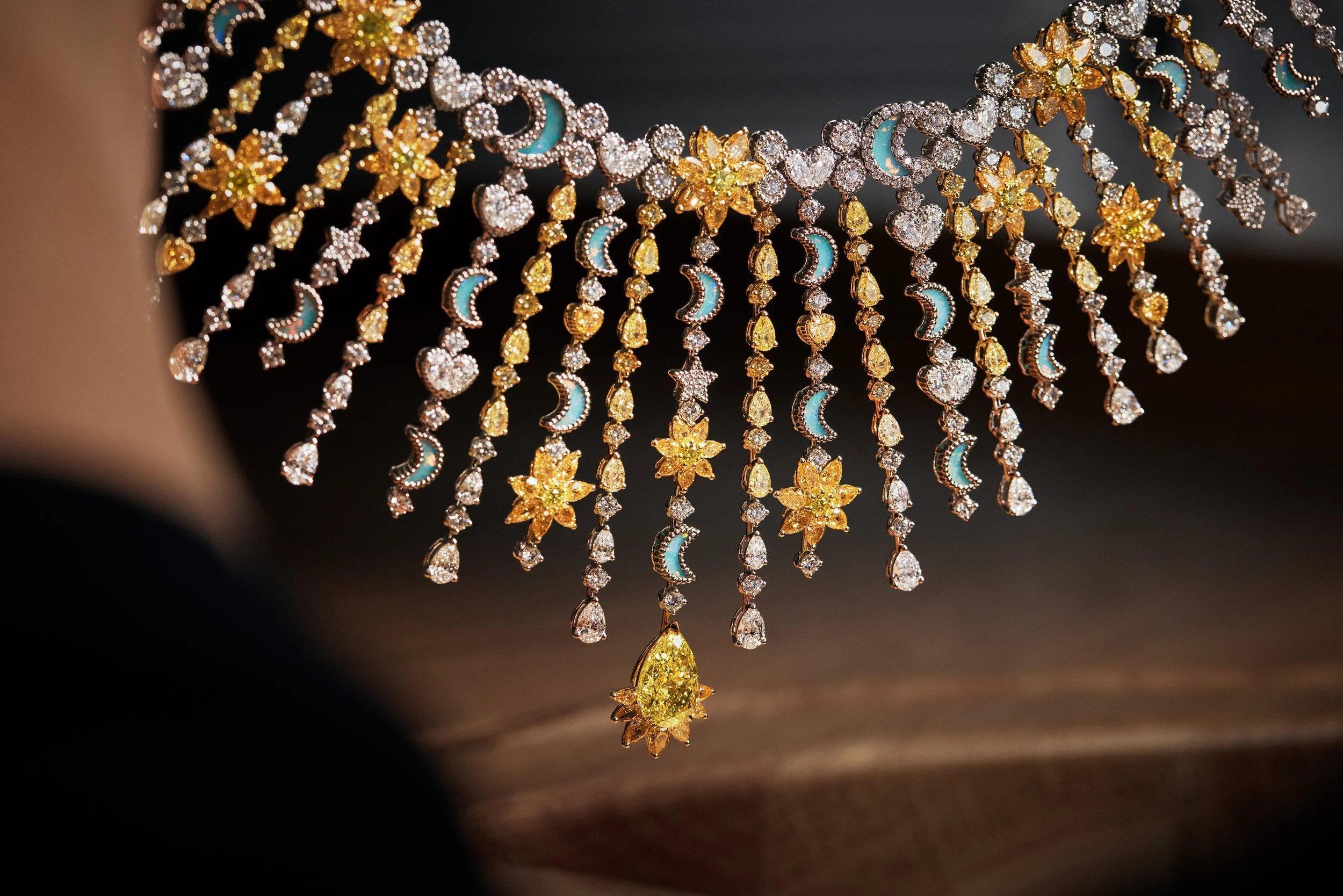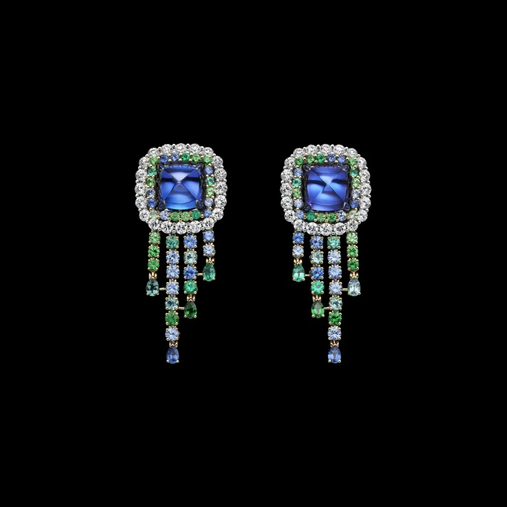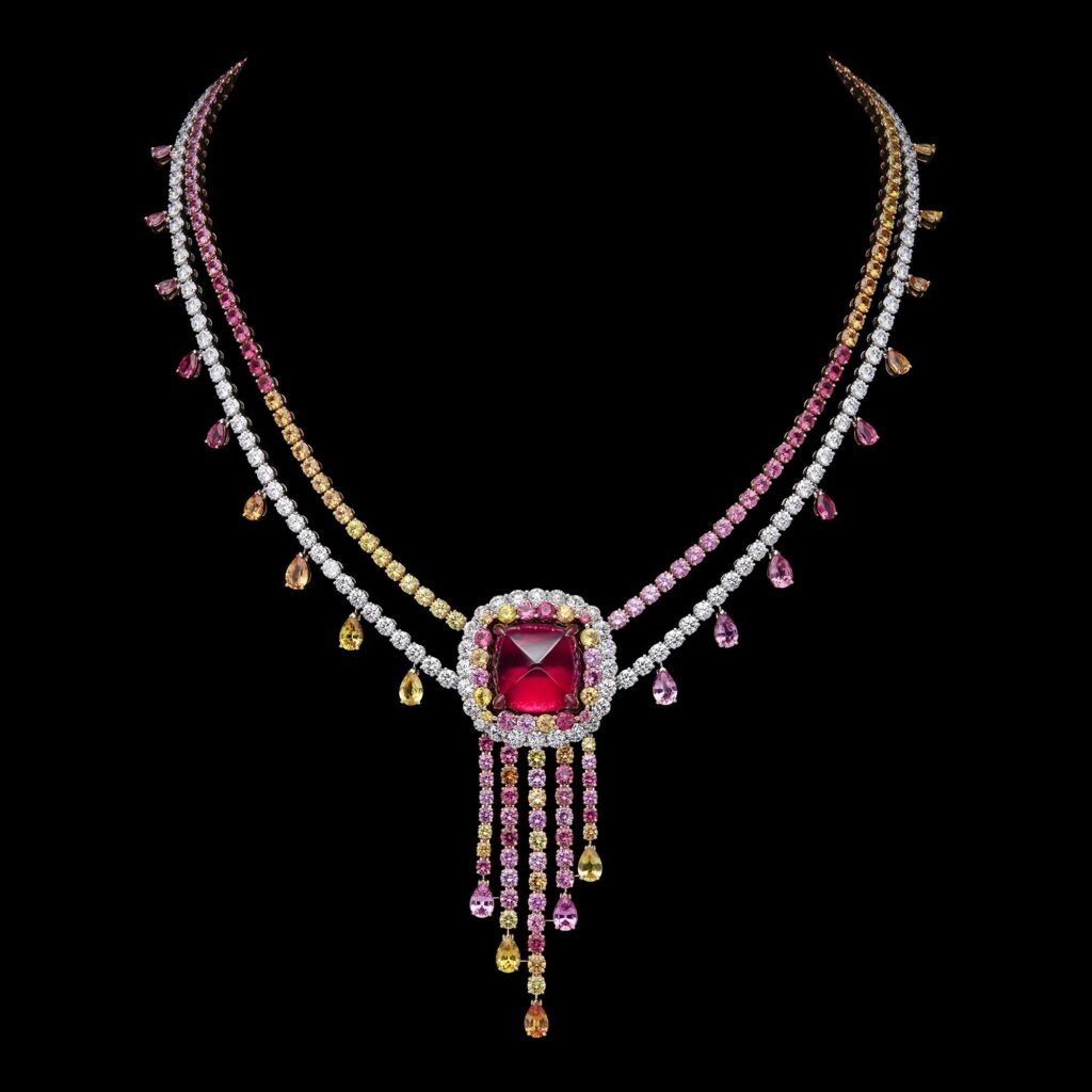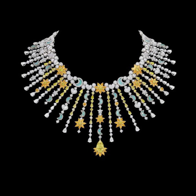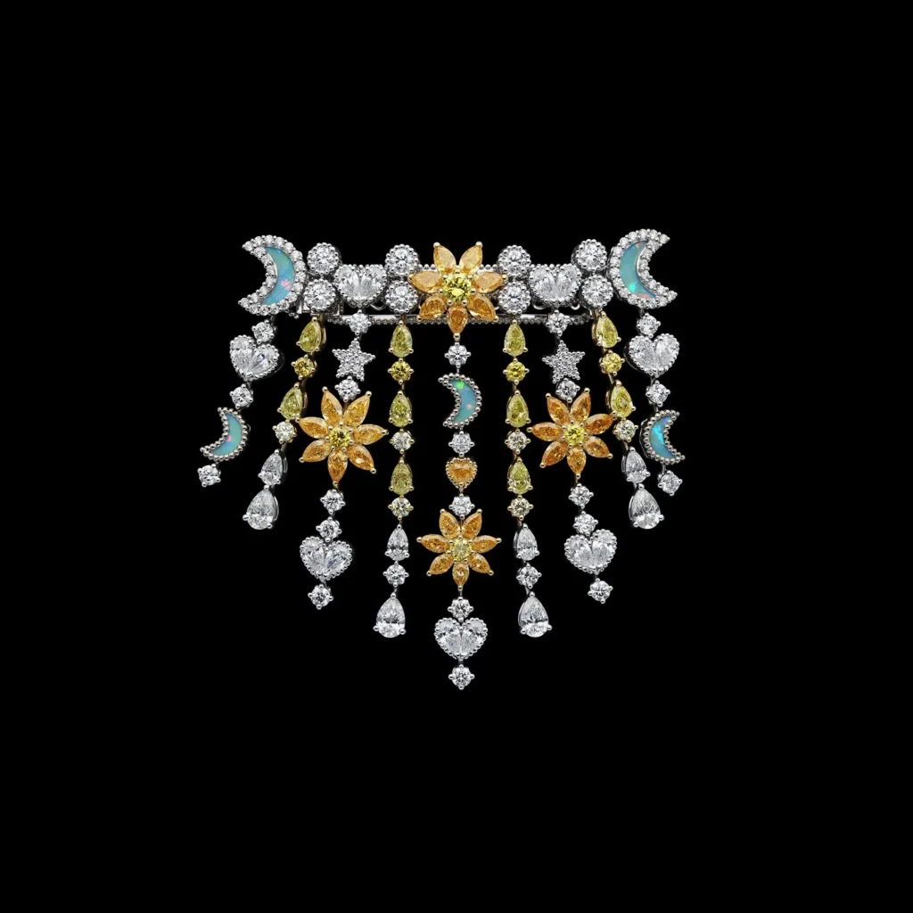 Com cerca de 60 criações, a coleção se constrói a partir de uma flora inventada, onde ouro, diamantes e gemas coloridas desenham composições que oscilam entre o real e o onírico. As peças evocam jardins em movimento, com estruturas que lembram franjas e tramas delicadas, criando leveza e fluidez, quase como tecidos em diálogo direto com o legado da alta-costura da casa francesa.