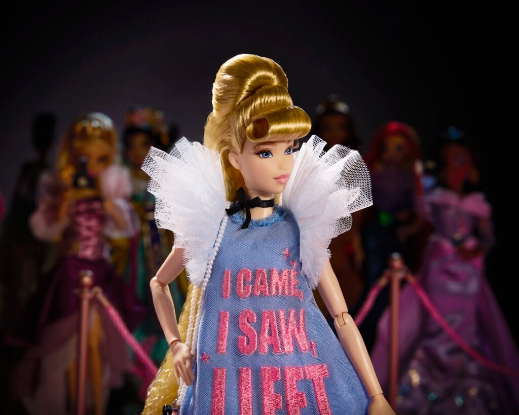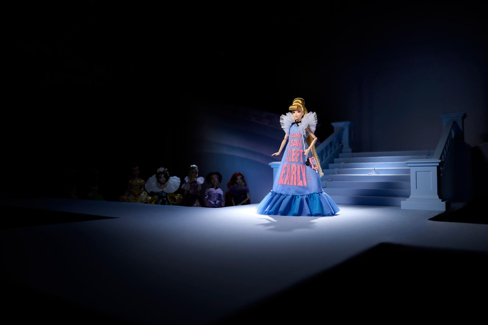 Ao invés de simplesmente reproduzir o vestido azul tradicional do conto de fadas, a nova versão incorpora todo o espírito experimental e artístico típico da Viktor & Rolf. A peça em miniatura é inspirada na coleção de alta costura Fashion Statements da grife, apresentada na temporada Primavera/Verão de 2019, e traduz esse vocabulário fashion em um look ousado e contemporâneo. A boneca veste um vestido de tule com camadas esculturais, bordados e a frase provocadora “I Came, I Saw, I Left Early” (“Eu cheguei, eu vi, eu saí cedo”), costurada com destaque no tecido, um toque de humor e atitude que ressignifica a própria narrativa da personagem.