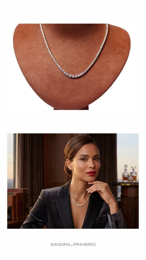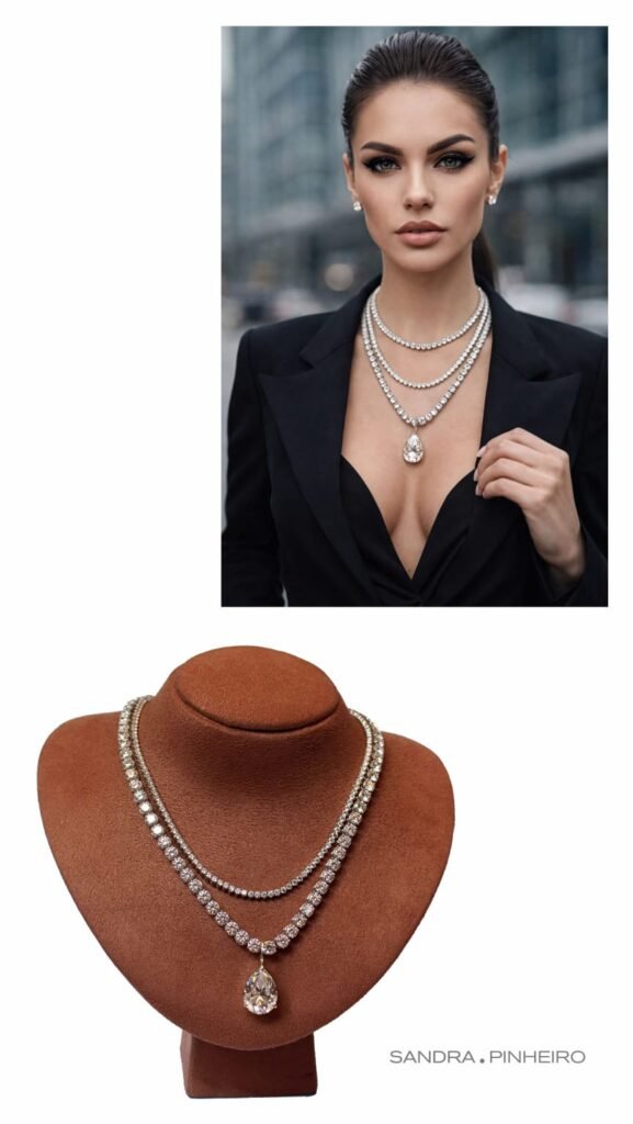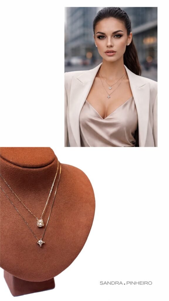 Na joalheria Sandra Pinheiro, a moissanite ganha protagonismo em designs elegantes e atemporais — colares, anéis, brincos e braceletes que valorizam sua luminosidade única e versatilidade.
