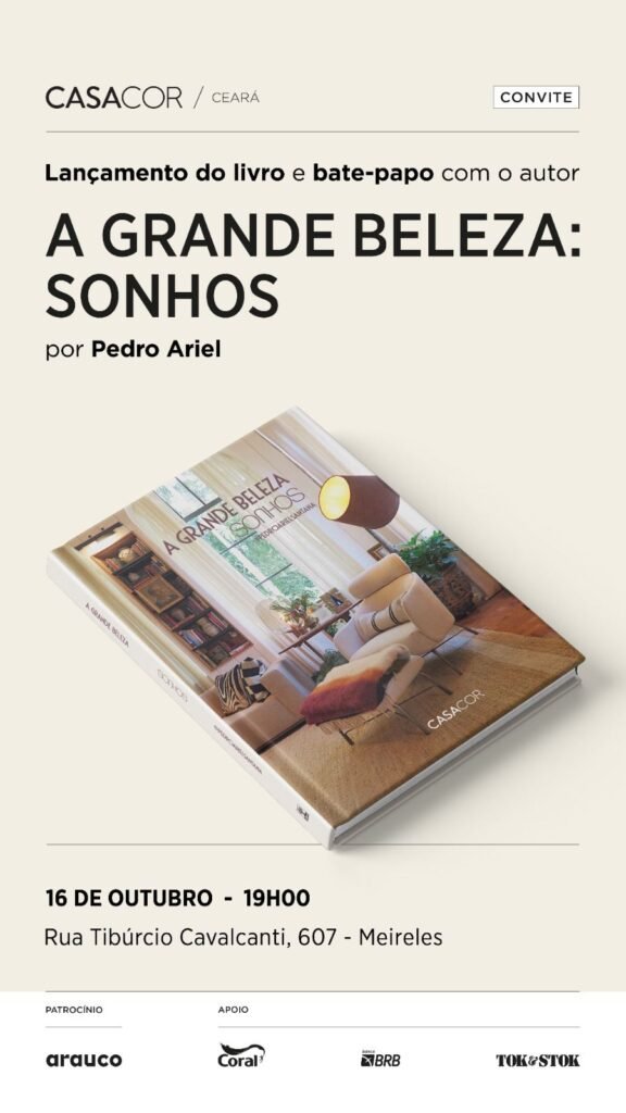 A CASACOR Ceará promove nesta quinta-feira, 16 de outubro, às 19h, o lançamento do livro A Grande Beleza: Sonhos, acompanhado de um bate-papo exclusivo com o autor e curador Pedro Ariel Santana, na sede da mostra — Rua Tibúrcio Cavalcanti, 607, Meireles.