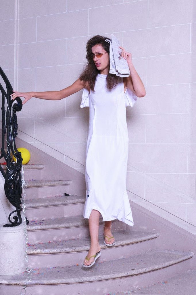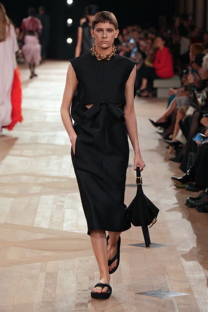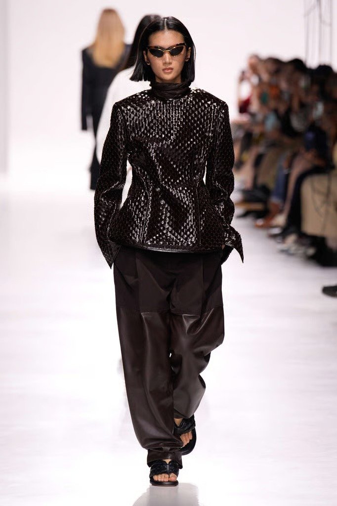 Rabanne e Bottega Veneta também embarcaram na vibe. Em Paris, a Rabanne surfou literalmente na estética beachcore, misturando borracha, metal e um perfume esportivo tropical. Já em Milão, a Bottega apresentou chinelos ultra sofisticados, com acabamento em couro e o tradicional intrecciato da marca, combinados a jaquetas e calças de pegada futurista.