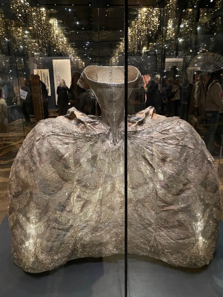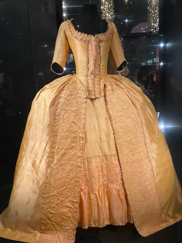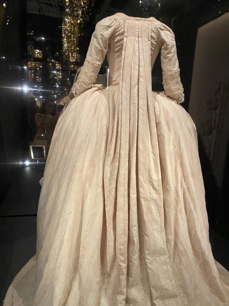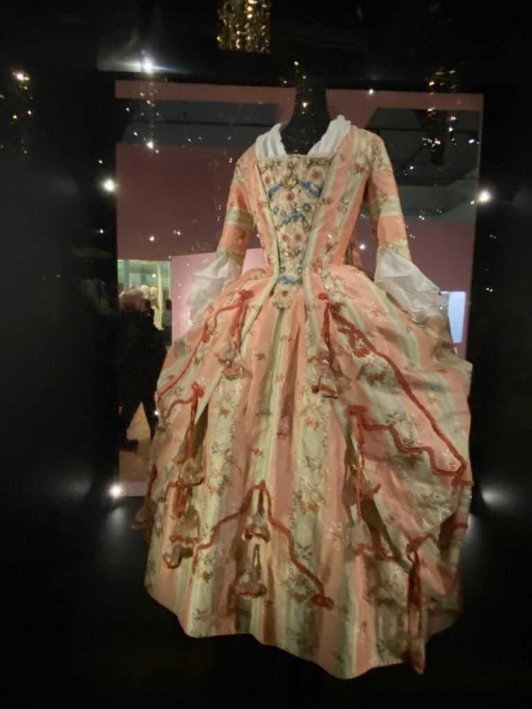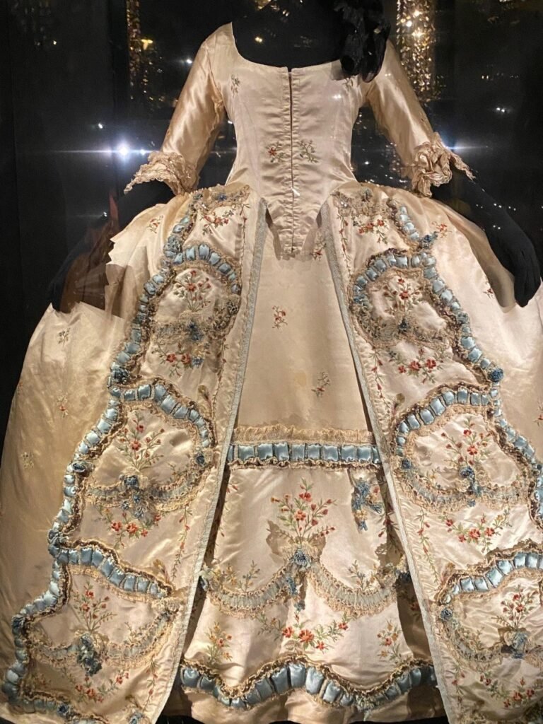 Com apenas 14 anos, Maria Antonieta fez uma entrada deslumbrante na sociedade da corte francesa em seu casamento com o delfim, herdeiro do trono, usando um vestido brilhante de tecido prateado. Nas duas décadas seguintes, seja em um baile no Salão dos Espelhos ou em uma ópera, todos os aspectos de seu vestido e aparência eram examinados, discutidos e copiados.