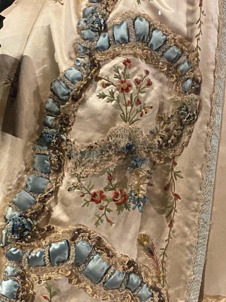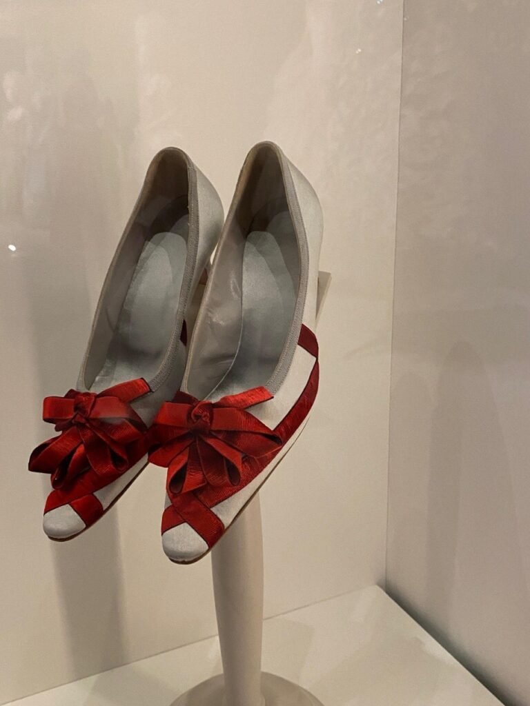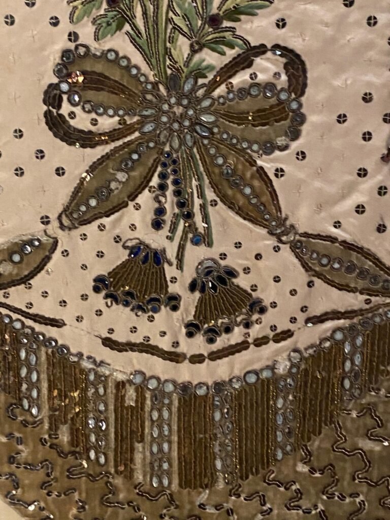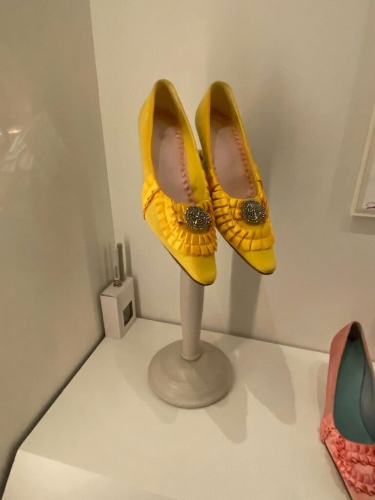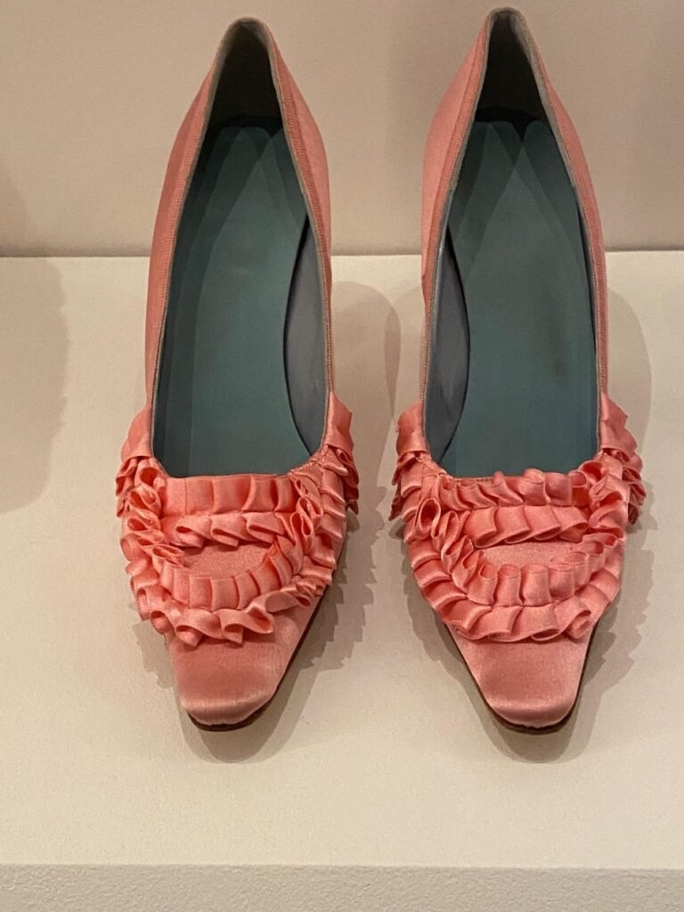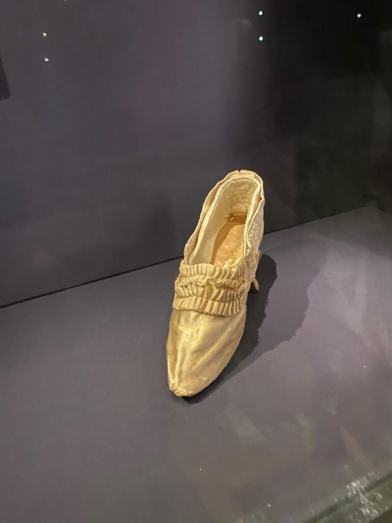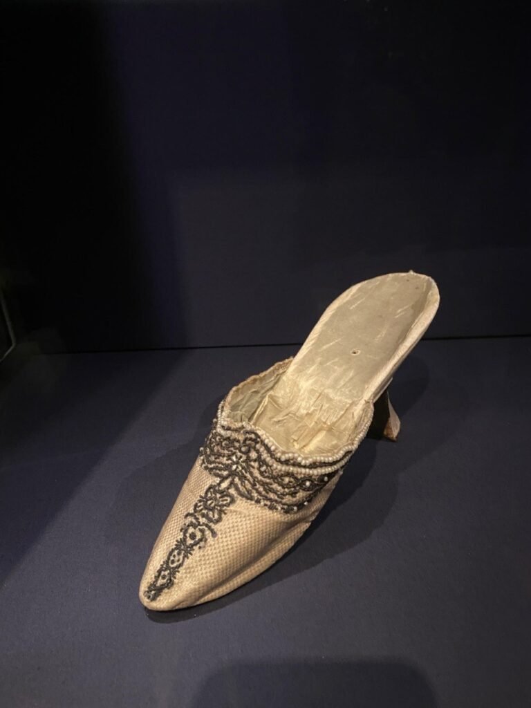Nos seus primeiros tempos na corte, Maria Antonieta recebia quatro pares de sapatos novos por semana. Rapidamente dominou o famoso “deslizar de Versalhes”, uma caminhada graciosa que dava a ilusão de os pés mal tocarem o chão. Ambos os sapatos são exemplares notáveis do seu guarda-roupa. O de cor cru é do seu estilo favorito, com o chamado salto “Saint Huberty”, em homenagem à cantora de ópera que o popularizou. A mule de seda com contas teria sido usada com o hábito formal, o traje mais formal da corte.