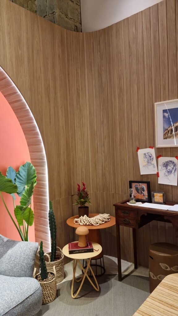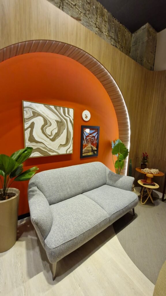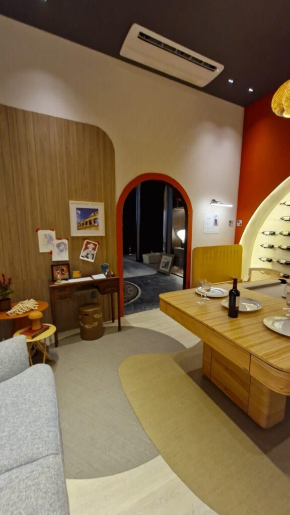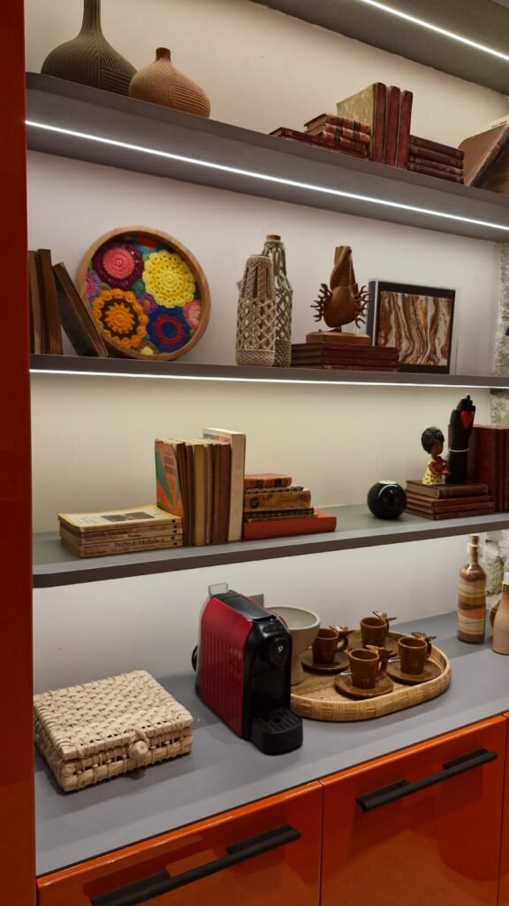 O ambiente conta ainda com o apoio técnico de outras marcas que agregam valor ao conceito. A Elettromec fornece os eletrodomésticos, integrando tecnologia e estética; a Tintas Coral assina as cores aplicadas no espaço; e a La Vinci Romazi entra com acabamentos que exploram contrastes sutis entre texturas. A presença do artesanato local, por meio da Ceart, ancora o projeto em uma identidade regional, aproximando o espaço da cultura cearense.