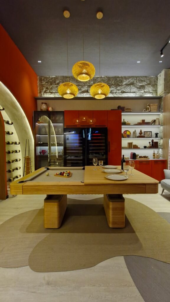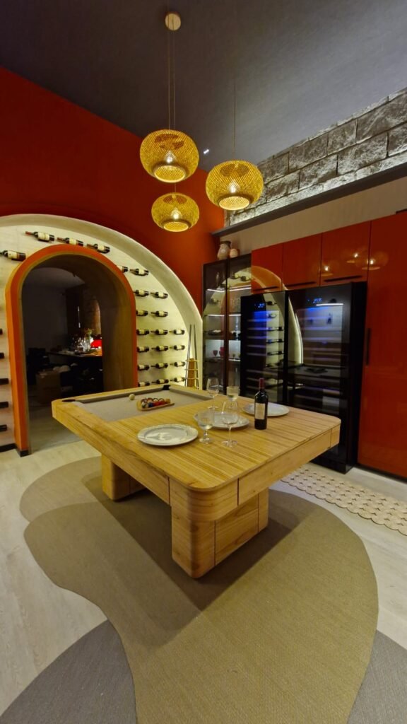 Na edição 2025 da CASACOR Ceará, a arquiteta Joana Rezende assina o ambiente “Adega Ciclo dos Sonhos”, um espaço concebido a partir da metáfora dos ciclos dos sonhos semear, cultivar e colher com foco na introspecção, permanência e tempo. A proposta ganha força na escolha dos materiais e no diálogo entre acabamentos, cores e texturas, resultado de uma articulação precisa entre marcas parceiras. A Dalmóbile Salinas responde pelos móveis planejados do espaço, com soluções que exploram sobriedade e funcionalidade. A mesa de sinuca que vira mesa de jantar da 7Ball possui destaque no ambiente trazendo a multifuncionalidade e apelo contemporâneo, enquanto os móveis da B&S Home reforçam a dimensão sensorial e afetiva da composição. Já os revestimentos da La Vinci se integram ao projeto com paleta alinhada aos tons predominantes cobre, terracota, cinza e madeira contribuindo para a atmosfera de acolhimento e introspecção proposta pela arquiteta.