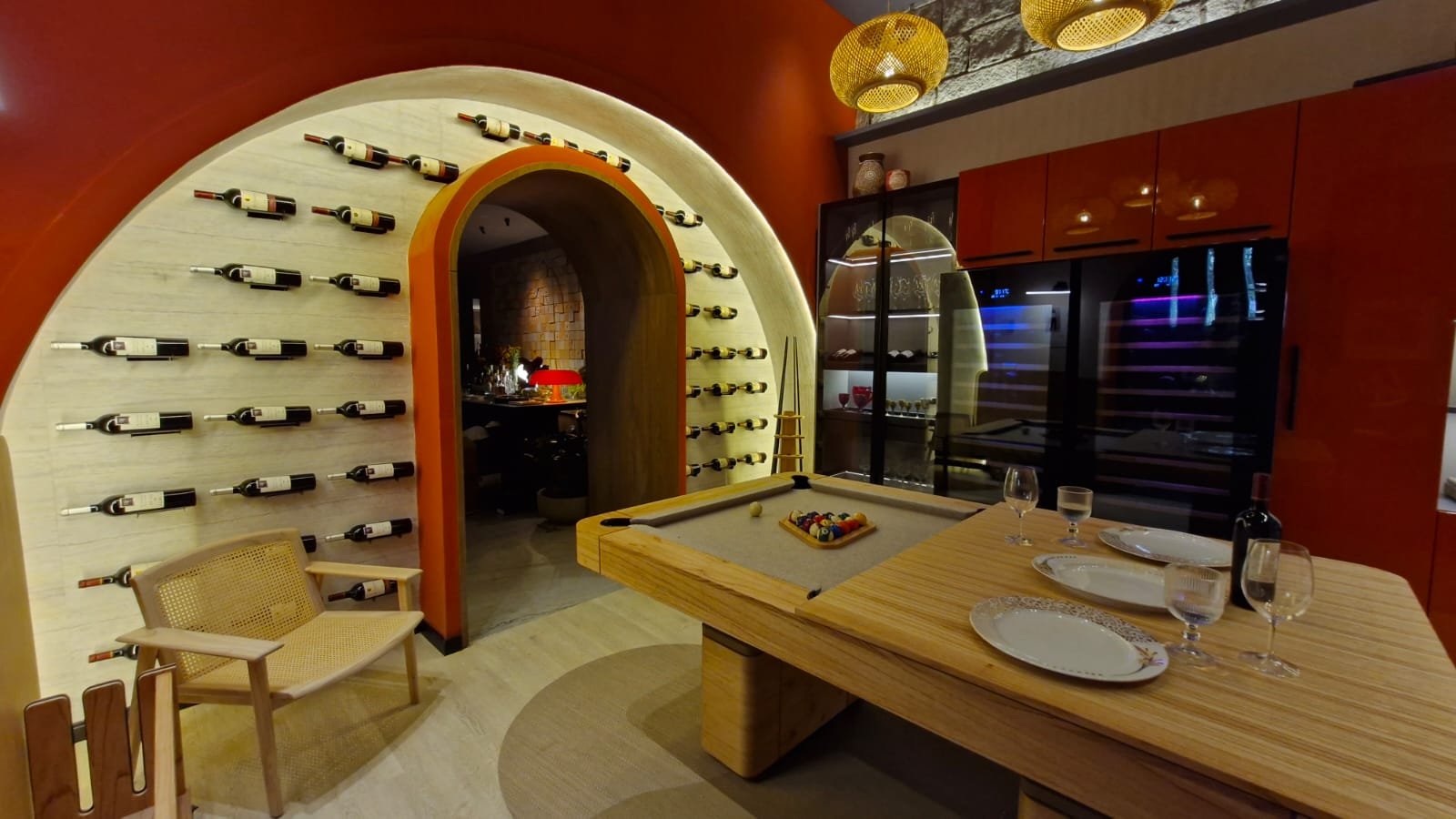 O resultado é um ambiente que valoriza a experiência sensorial e a temporalidade, com protagonismo para a escolha precisa dos parceiros e a integração entre arquitetura, design e narrativa. Com 25 m², o ambiente integra sala de jantar e living, preservando o arco original da casa e valorizando as pedras expostas. “A Adega foi pensada para celebrar conquistas, harmonizar momentos e desfrutar bons vinhos enquanto semeamos, cultivamos e colhemos experiências da vida adulta”, explica Joana Rezende.