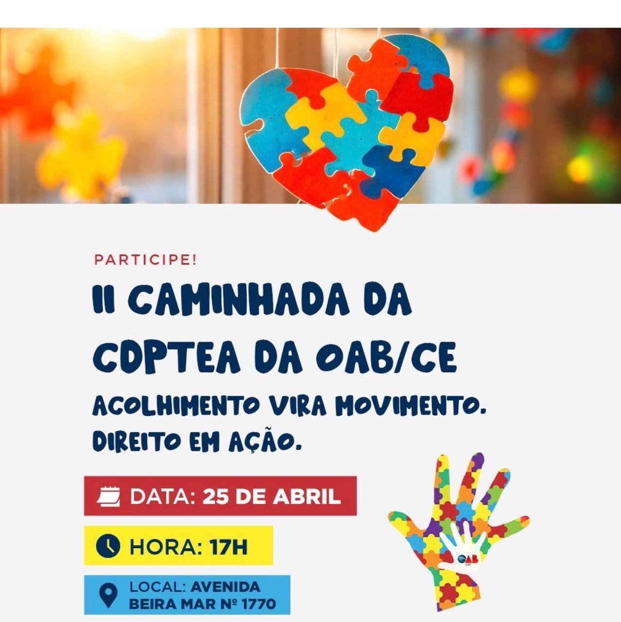A Ordem dos Advogados do Brasil – Secção Ceará realiza, no próximo sábado (25/4), a 2ª Caminhada pelo Autismo, promovida pela Comissão de Direito da Pessoa com Transtorno do Espectro do Autismo (CDPTEA). A concentração será às 16h, na Avenida Beira-Mar, em frente ao Náutico.