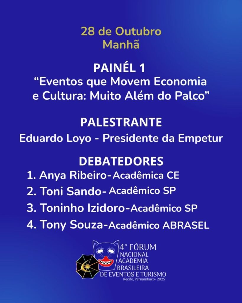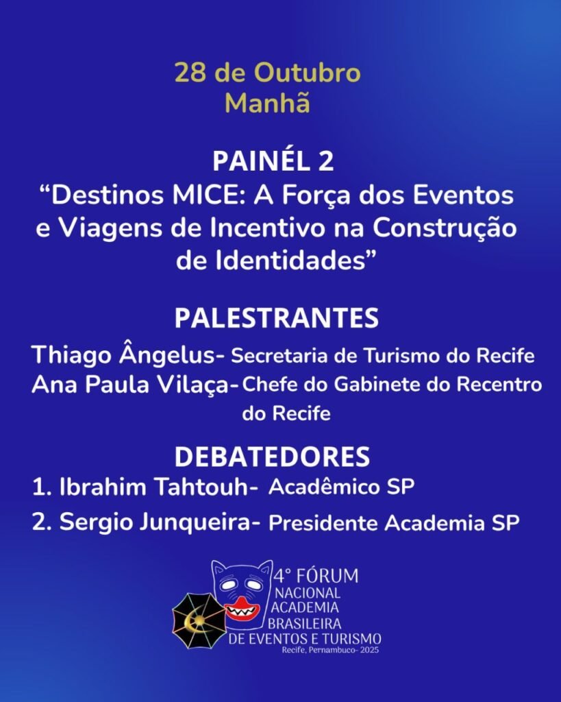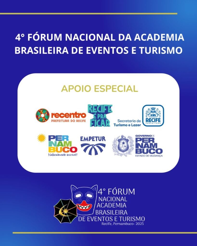 O 4º Fórum Nacional da Academia Brasileira de Eventos e Turismo reunirá, no dia 28 de outubro, no Gabinete Português de Leitura, em Recife (PE), acadêmicos, lideranças e profissionais do setor para discutir os caminhos que conectam eventos, cultura, economia e identidade nacional.