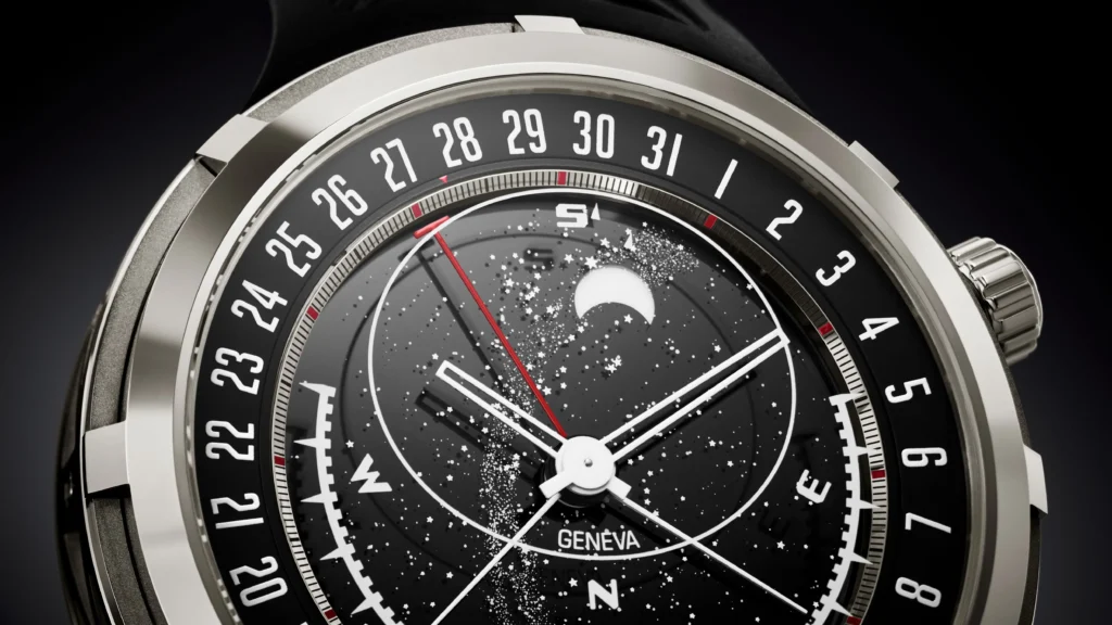Essa abordagem mais “celestial” não é isolada. Casas como Van Cleef & Arpels seguem explorando a lua, o dia e a noite como elementos narrativos, com relógios que funcionam quase como objetos contemplativos. Mostradores estrelados, movimentos que simulam ciclos naturais e indicações poéticas transformam a leitura do tempo em ritual, menos funcional, mais sensorial.