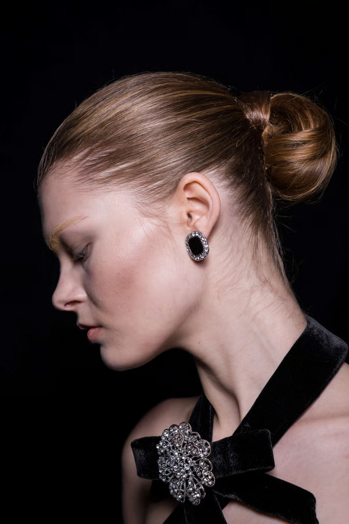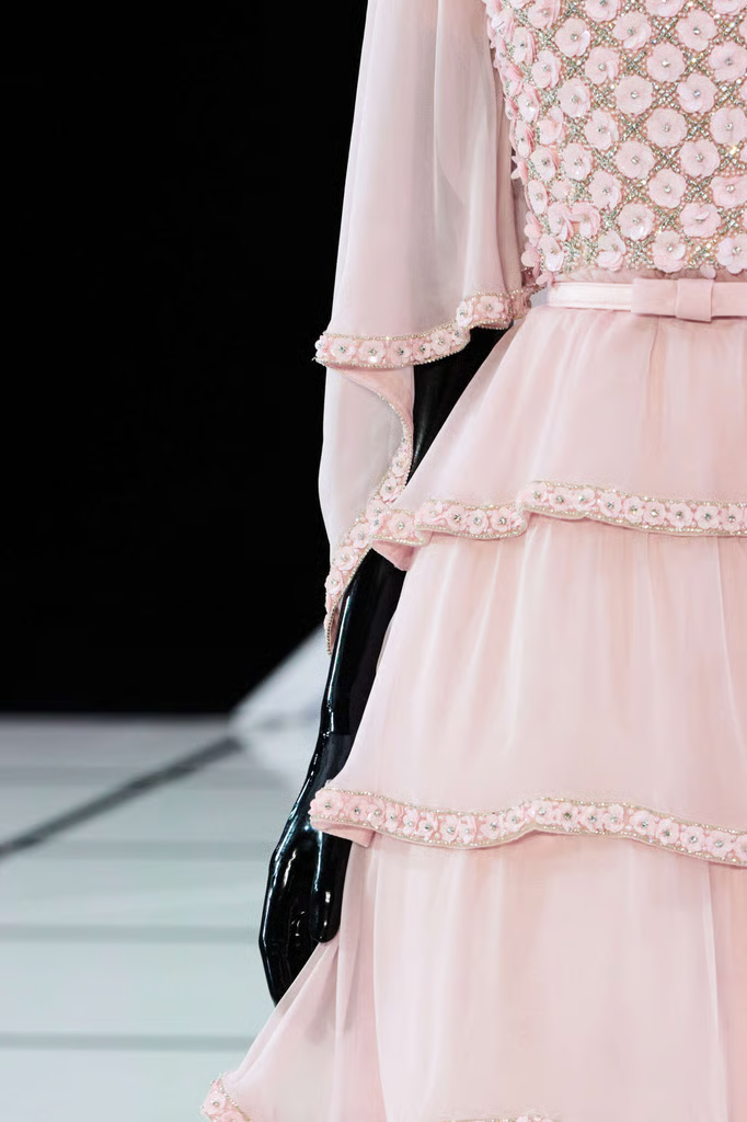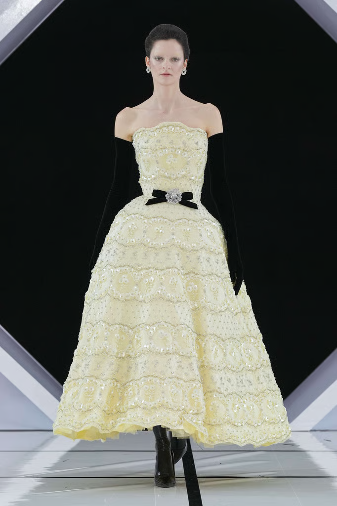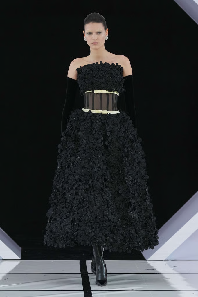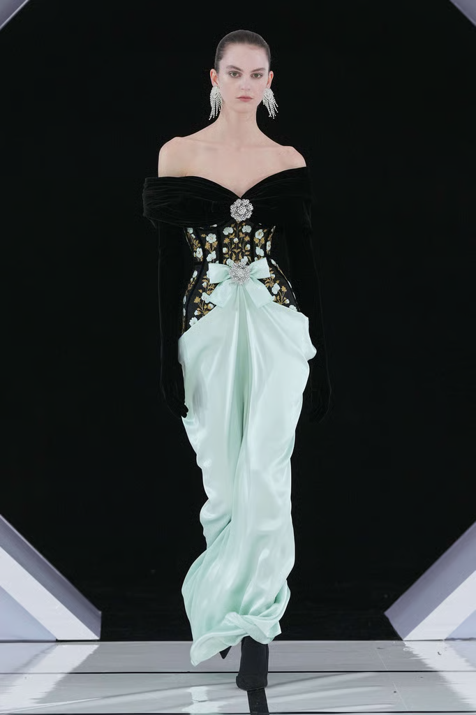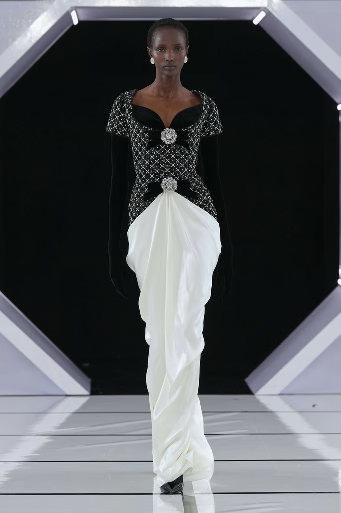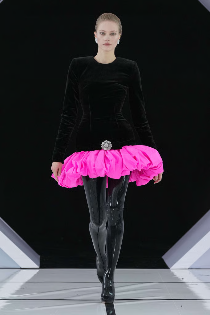 O designer também trouxe tecidos inesperados para a temática invernal. Em vez de depender apenas de tweeds e veludos tradicionais, ele incorporou materiais brilhantes, vinis texturizados e superfícies que capturavam luz. Isso fez com que cada peça parecesse viva, mudando de personalidade a cada passo da modelo na passarela.