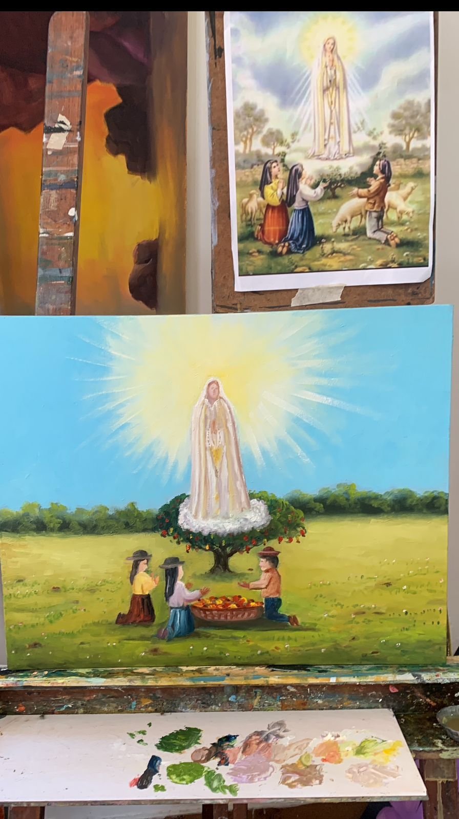 Pintei uma tela inspirada na imagem de Nossa Senhora de Fátima, em memória de minha querida mãe, Maria Sousa Marques, mulher de fé profunda e devota a Mãe de Jesus. A criação dessa obra nasceu do mais puro sentimento de amor filial, saudade e gratidão, transformando a dor da ausência em expressão de luz e espiritualidade. Cada traço e cada cor revelam o vínculo sagrado entre mãe e filha, unidas eternamente sob o manto protetor da Virgem Santíssima.