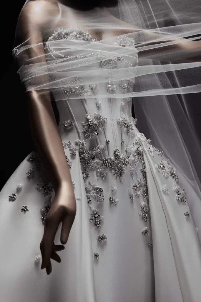 Ao mesmo tempo, a superfície ganha protagonismo. Bordados densos percorrem os tecidos como narrativas visuais, misturando florais, arabescos e elementos barrocos que remetem aos interiores dos palácios de Verona. Cristais e pérolas aparecem como pontos de luz calculados, enquanto rendas delicadas desenham transparências que acompanham o corpo com precisão, criando uma estética que oscila entre leveza e dramaticidade.