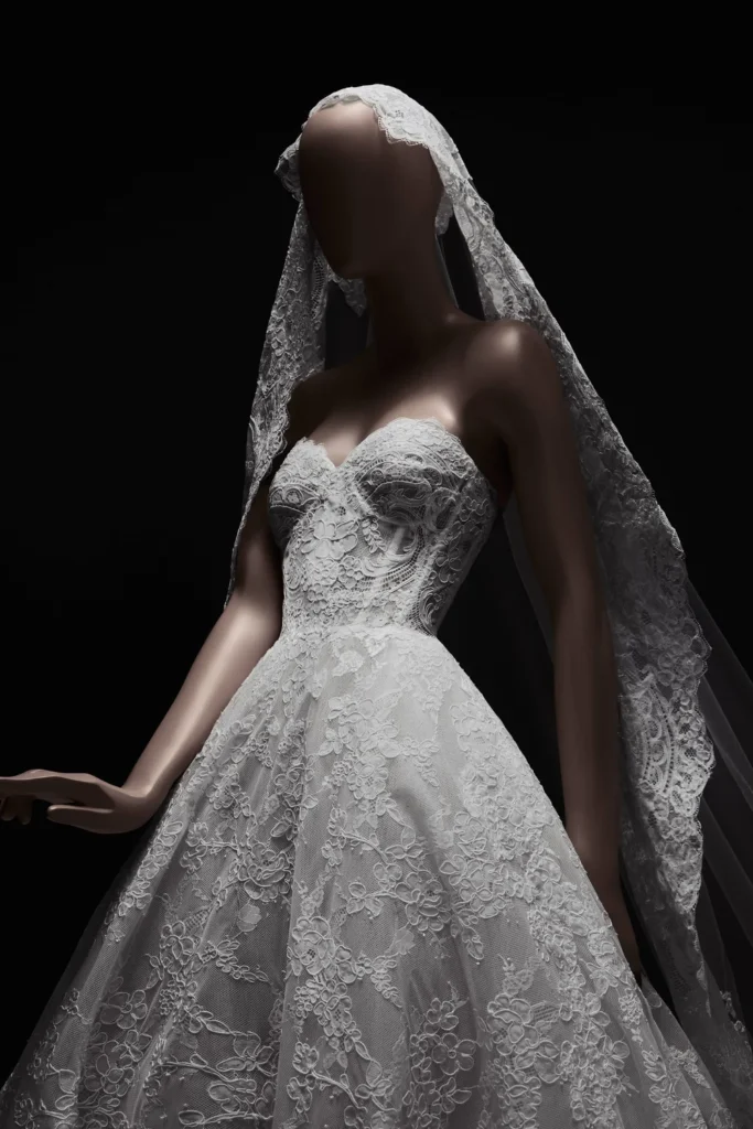 Há também um jogo constante entre opacidade e revelação. A coleção explora transparências sutis, sobreposições e estruturas que sugerem movimento, como se cada vestido fosse pensado para acompanhar uma narrativa em cena, uma noiva que não apenas veste, mas encena. Nesse contexto, o vestido deixa de ser apenas traje e passa a funcionar como extensão de um personagem, reforçando a ideia da noiva como figura central de um enredo atemporal.